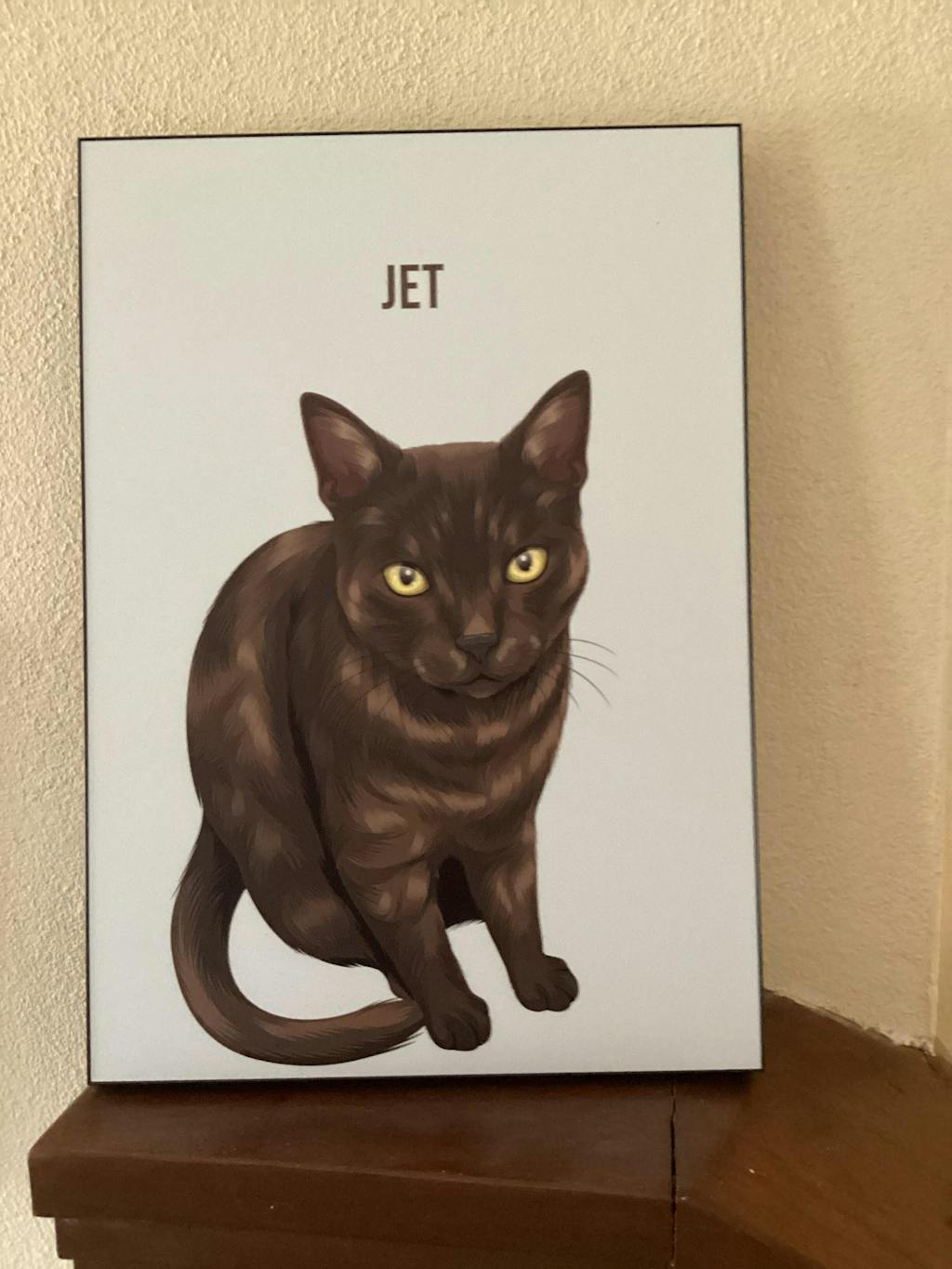 Sadly, our cat Jet died a week after our dog, we ordered a portrait of our dog and loved it! Now our cats portrait has arrived and it looks great also! Our family love them both, they are a lovely reminder of our very missed pets. The likeliness of the portrait from the photo is perfect with one change I wanted to make, which was easy and quick when requested with the artist. The photo was a bit blurry and taken from a weird angle but the artist corrected all that and the portrait looks better! The website was easy to use and postage quick. I couldn’t fault Poster and Paw. Looking forward to getting a matching pop art portrait of our other dog now😀